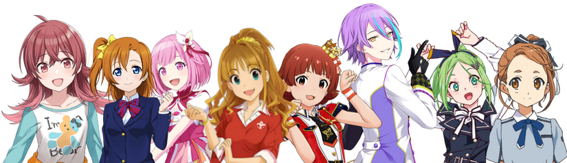 Idolm@ster Million Live, Cinderella Girls, Shiny Colors, μ's, 22/7, Bandori, PJSekai, Taiko no Tatsujin, Maimai, Chunithm